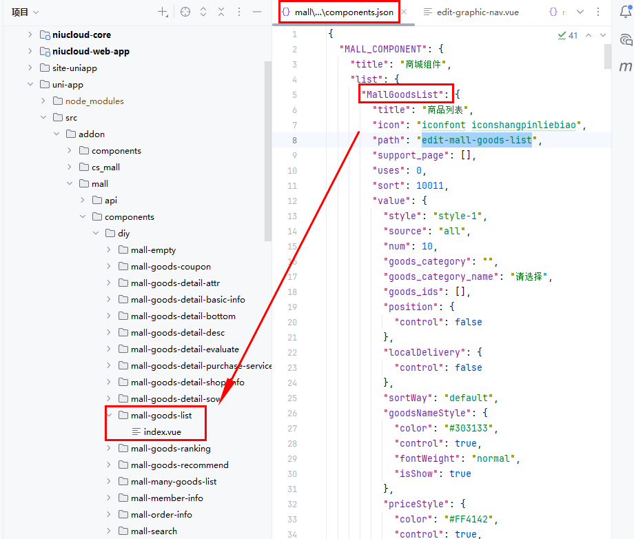 例如:组件关键字 key 为 MallGoodsList 。渲染组件名称就是:mall-goods-list,将驼峰命名改成横杠 - 分割即可。注意:组件文件名称是小写
