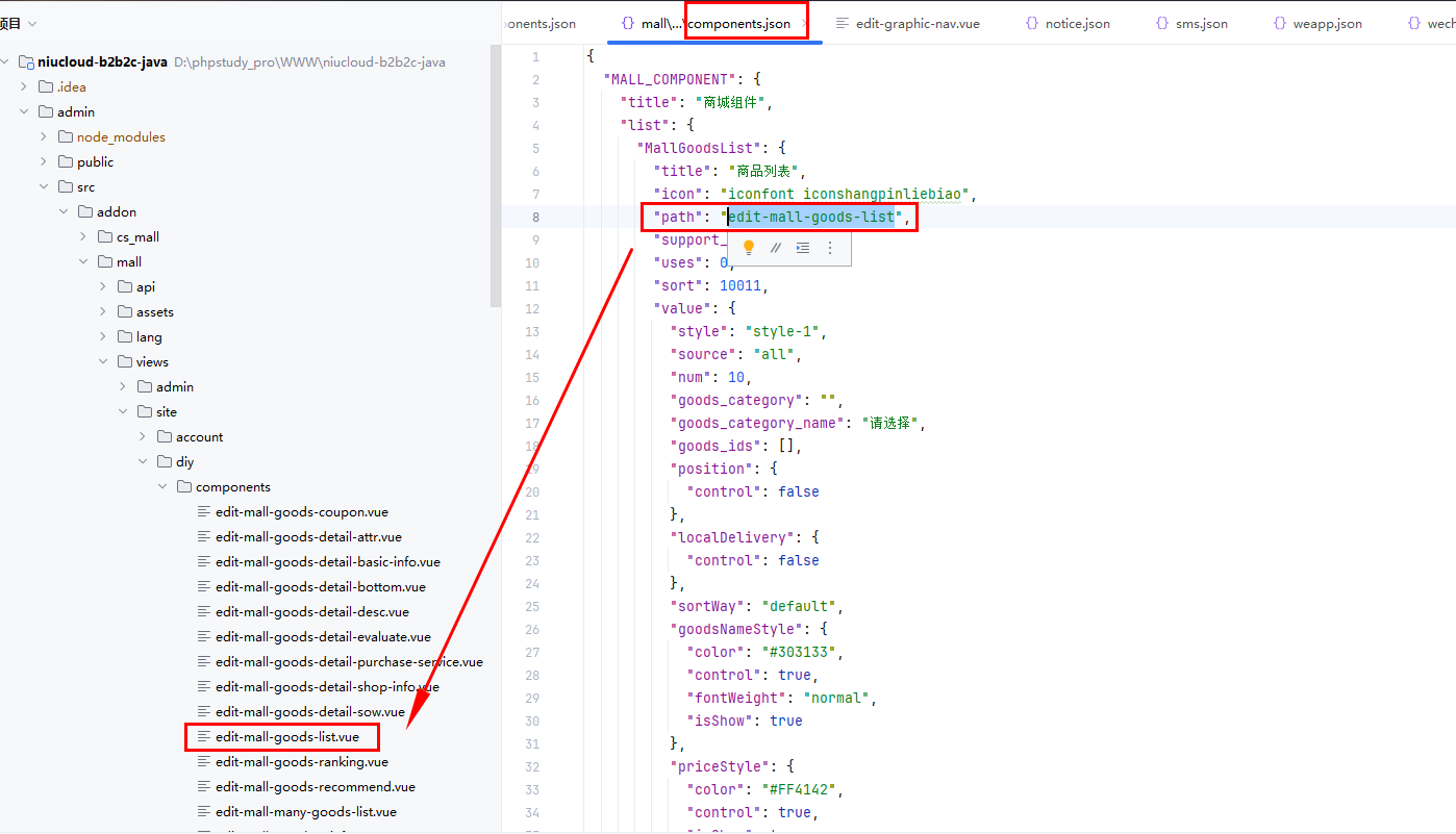 例如:path 为 edit-mall-goods-list,编辑属性组件文件名称就是:edit-mall-goods-list.vue