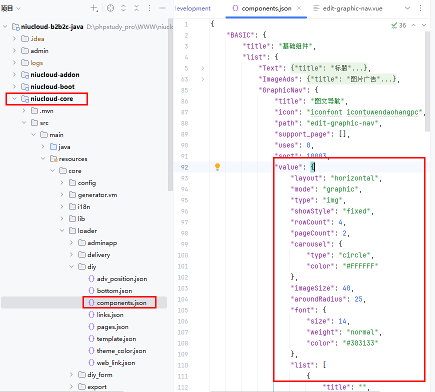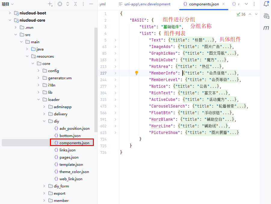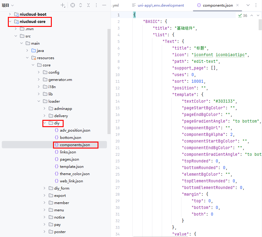 框架开发的自定义组件配置在 niucloud-core/src/main/resources/core/loader/diy/components.json,如图所示