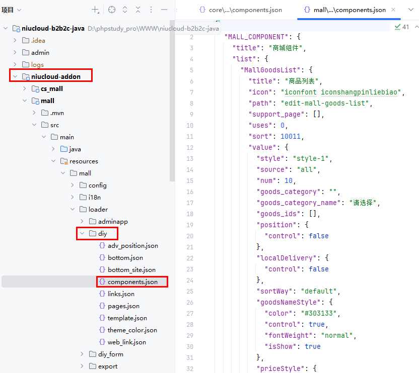 在 niucloud-addon/mall/src/main/resources/mall/loader/diy/ 目录下,新建 components.json 文件