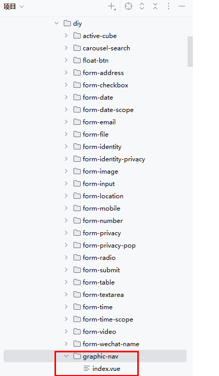 比如上面图文导航组件名称 GraphicNav,对应 uniapp 的自定义组件名称就是 graphinc-nav,下面就是针对图文导航的文件定义以及页面,文件位置:uni-app/src/app/components/diy/graphic-nav