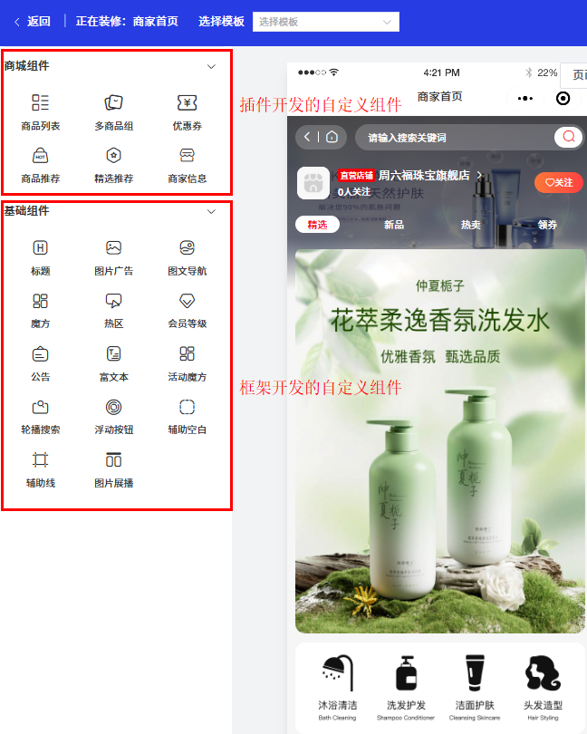 插件开发的自定义组件:第三方开发者通过插件机制开发的组件,如商城组件等业务组件