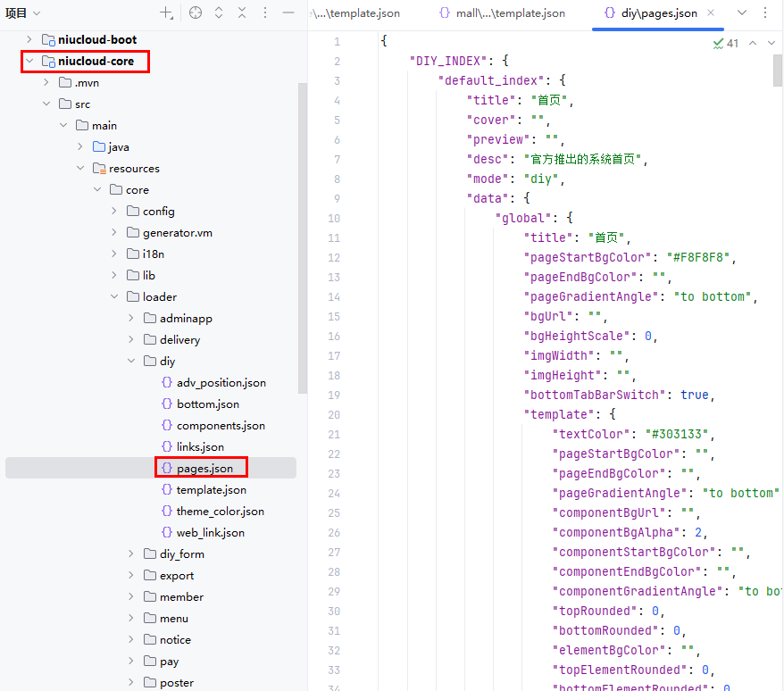文件位置:niucloud-core/src/main/resources/core/loader/diy/pages.json