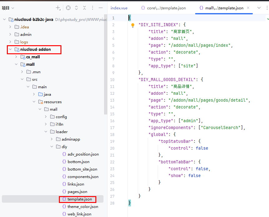 文件位置:niucloud-addon/mall/src/main/resources/mall/loader/diy/ 目录下,新建 template.json