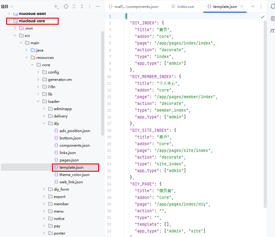 文件位置:niucloud-core/src/main/resources/core/loader/diy/template.json