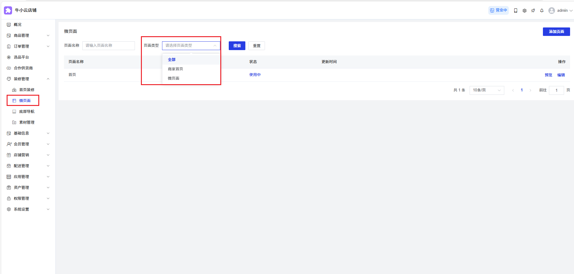 系统框架开发的页面类型:首页、个人中心、商户、微页面