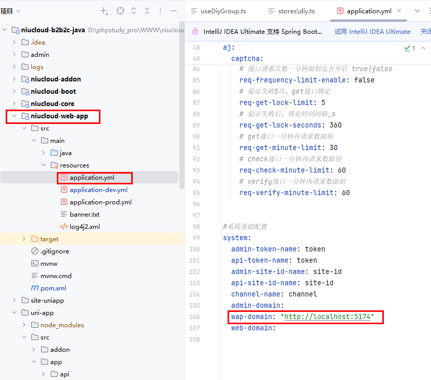 niucloud-web-app/src/main/resources/application.yml 文件中默认设置了手机端的访问地址