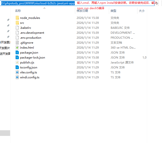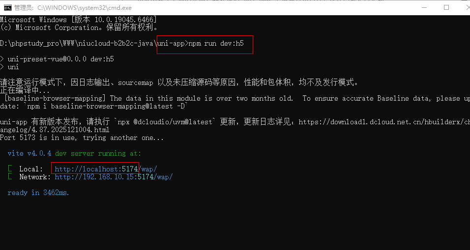 填写好配置文件后,开始执行编译命令。先在指定目录下执行命令,编译h5