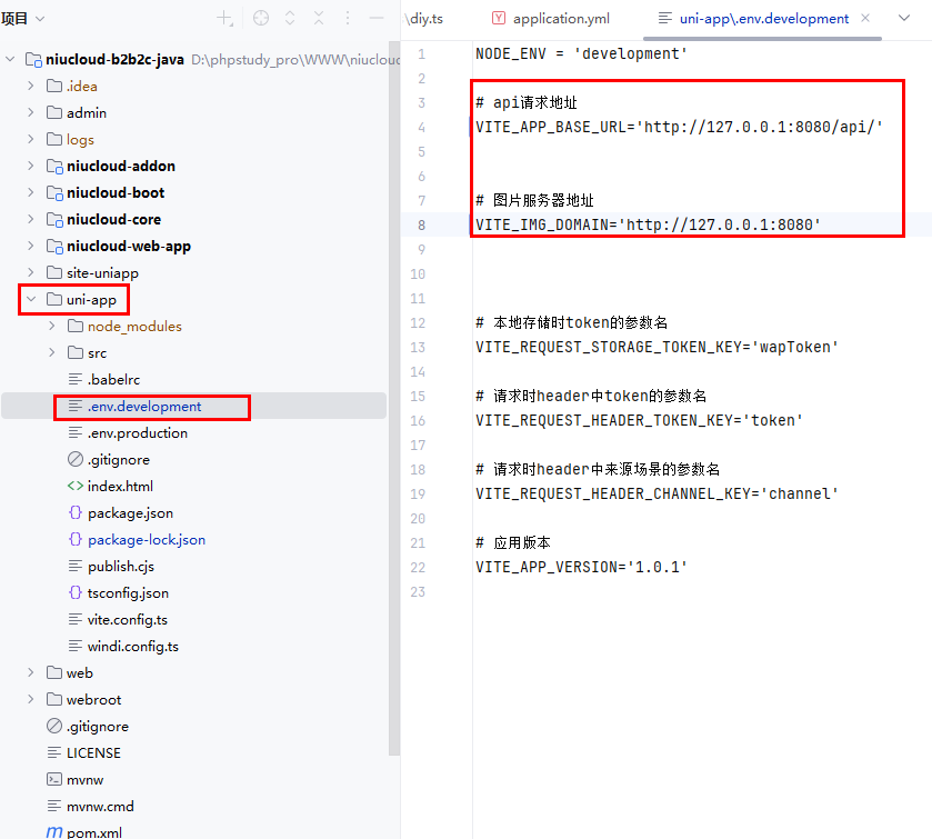 打开 uni-app 下的 .env.development 配置文件,填写配置文件中的 api 请求地址和图片服务器地址