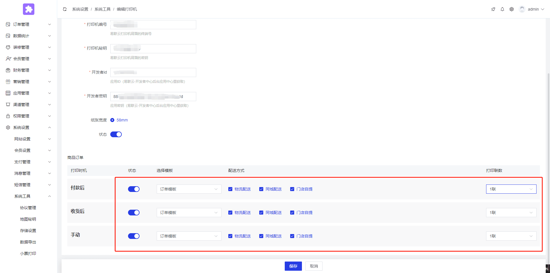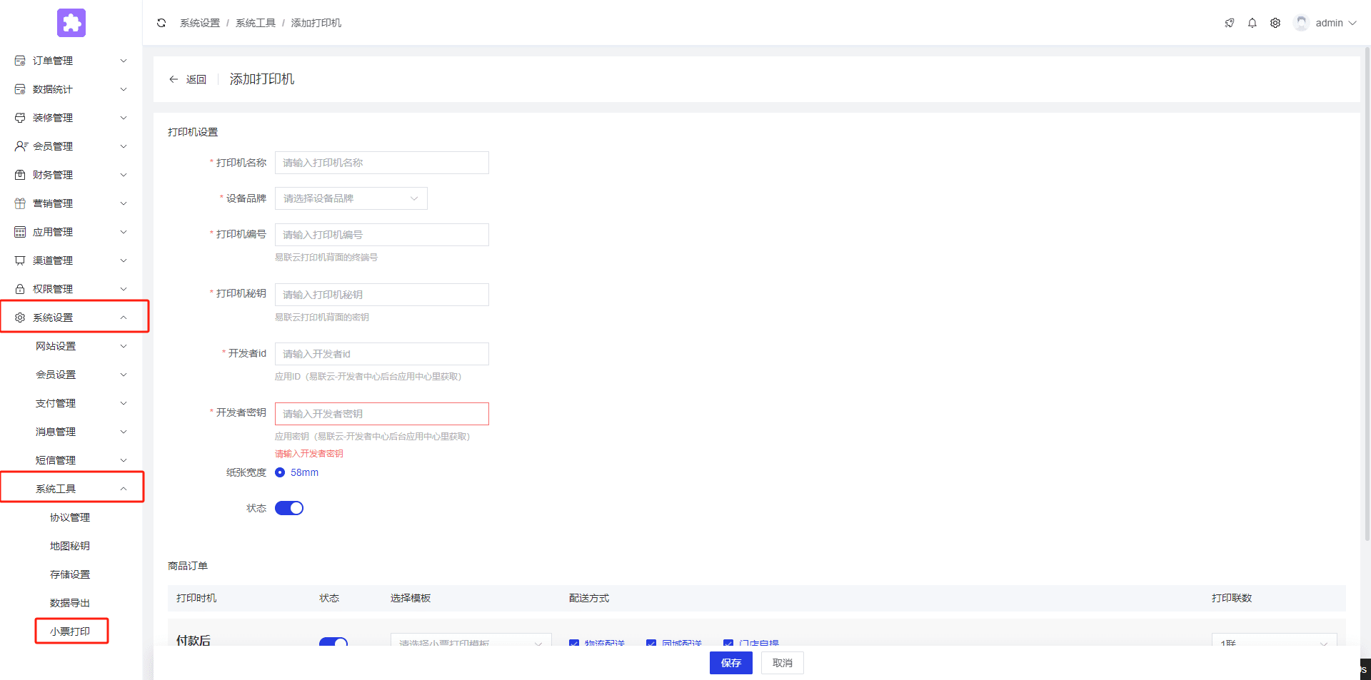将终端号和密钥分别填写到后台打印机编号和打印机秘钥中