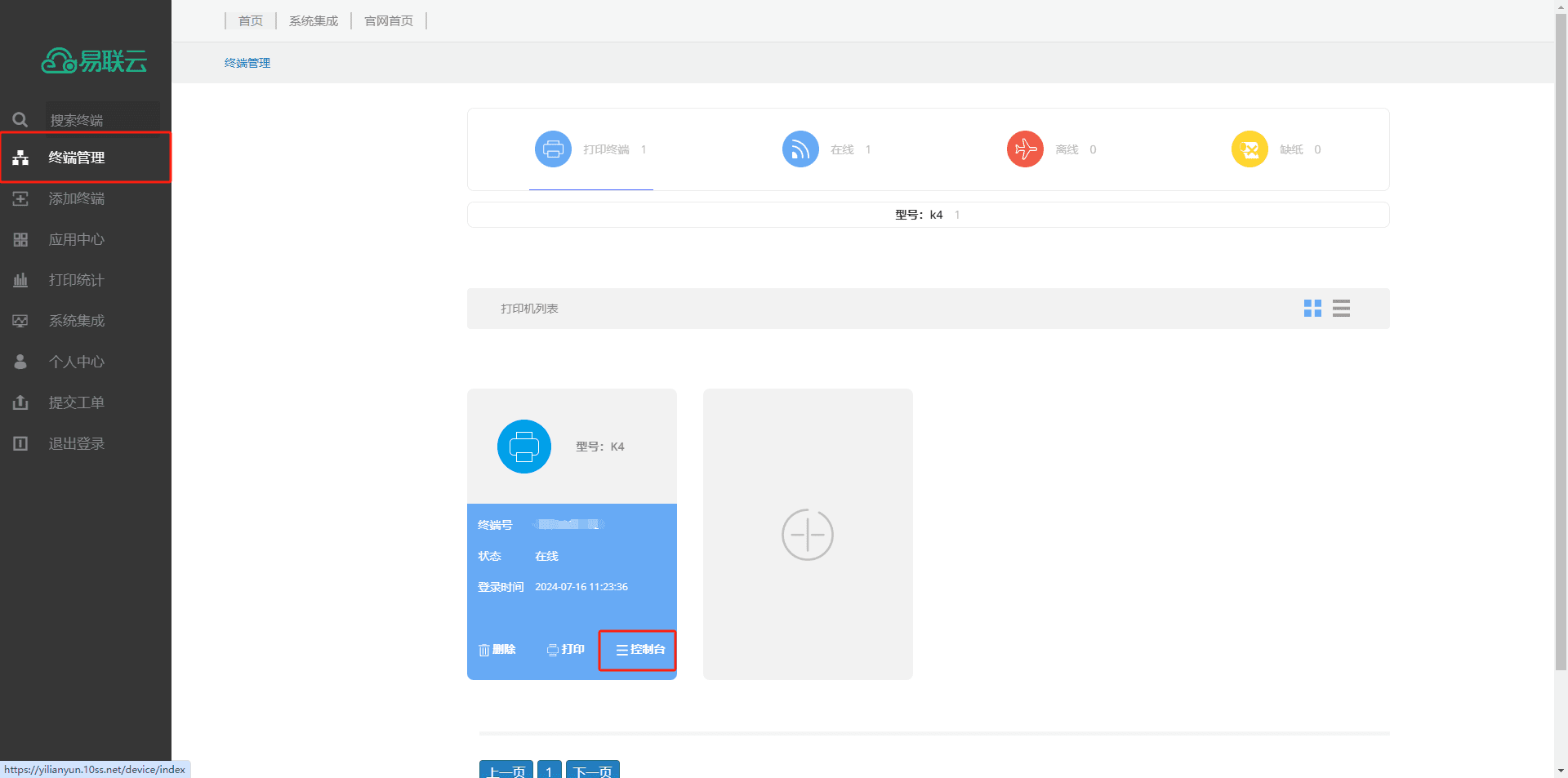 4.在侧边栏选择终端管理,在打印机列表中选择已经添加好的打印机,点击控制台