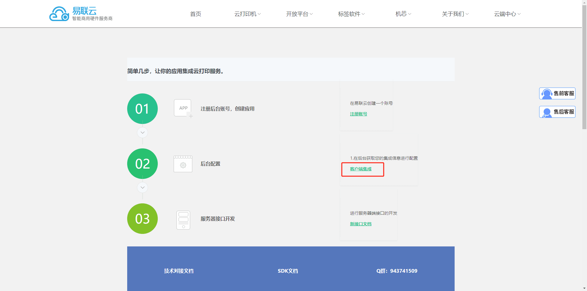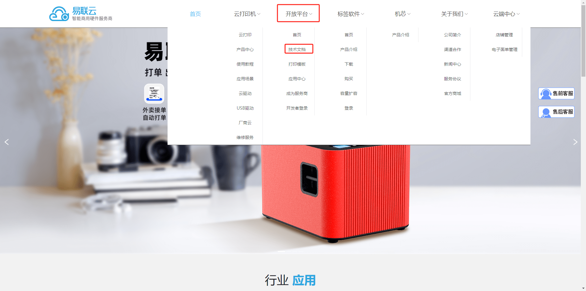 6.进入易联云开发网站https://www.yilianyun.net/,点击开放平台,选择技术文档