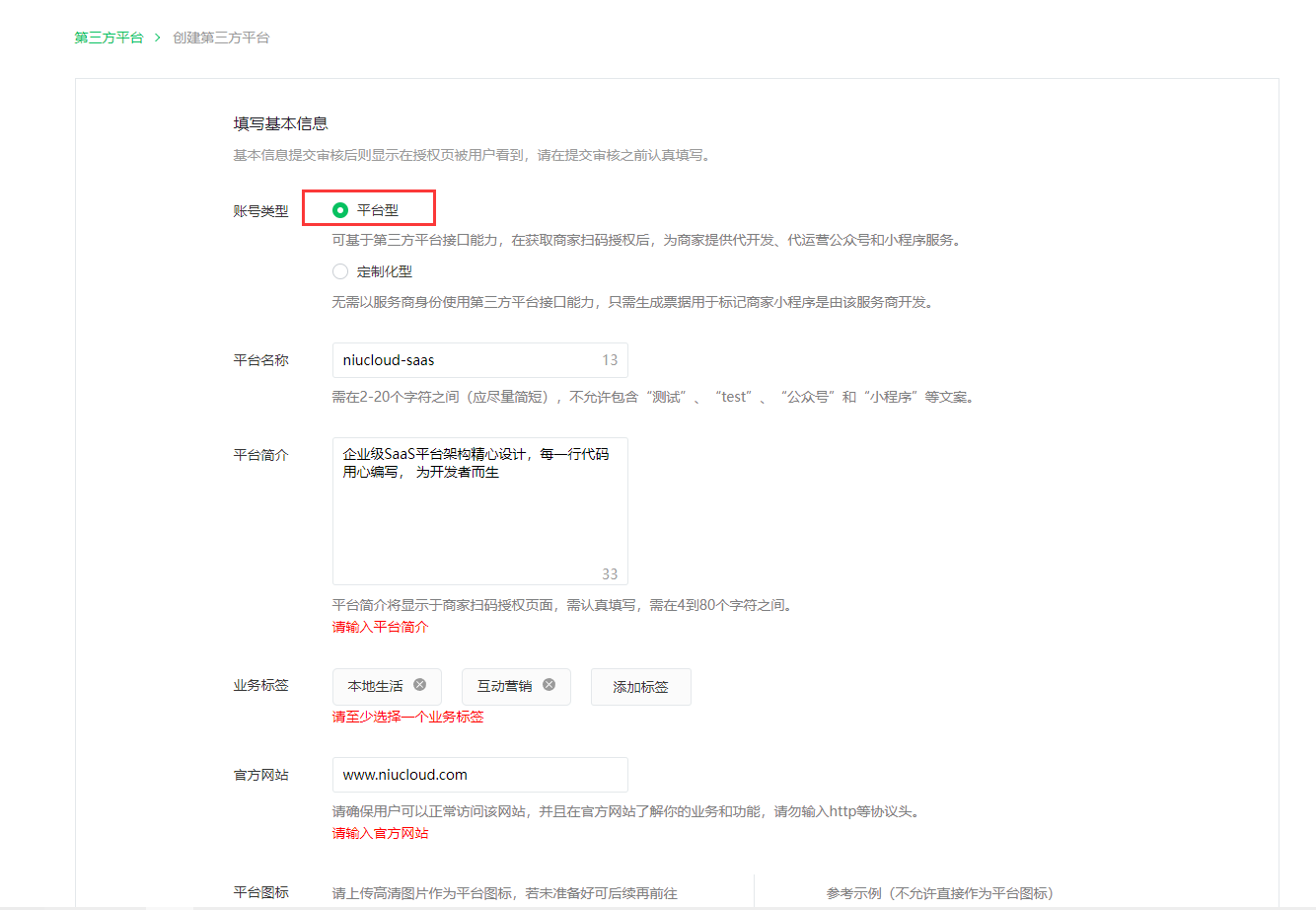账号类型选择平台型,其他信息根据自己实际情况填写
