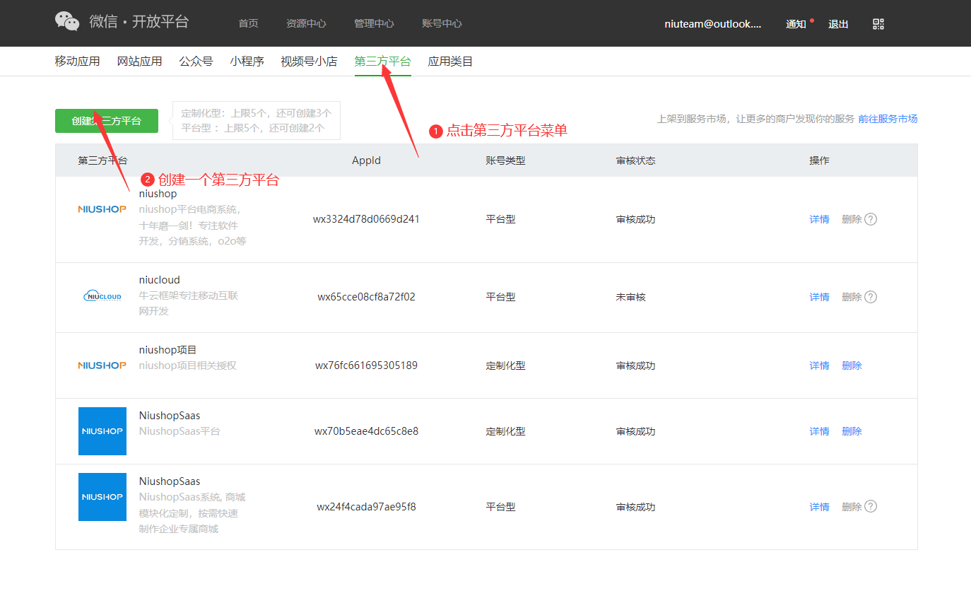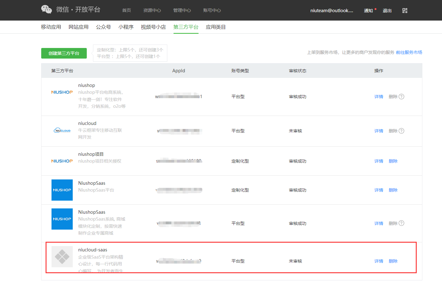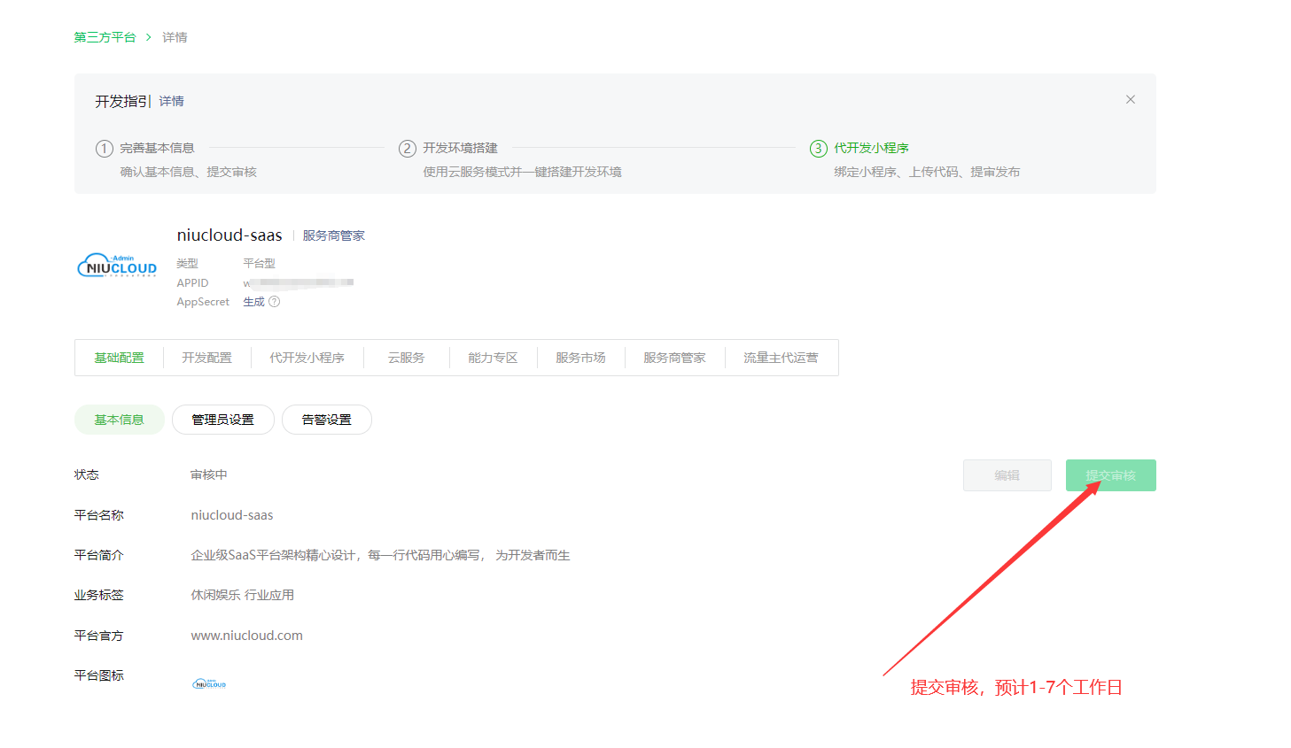 2、创建成功之后点击详情,将创建的平台应用提交审核,审核周期预计1-7个工作日