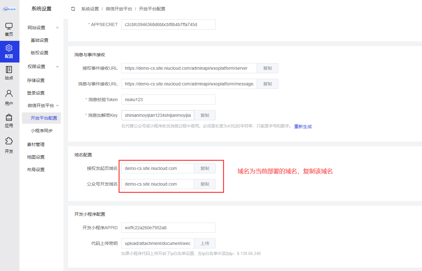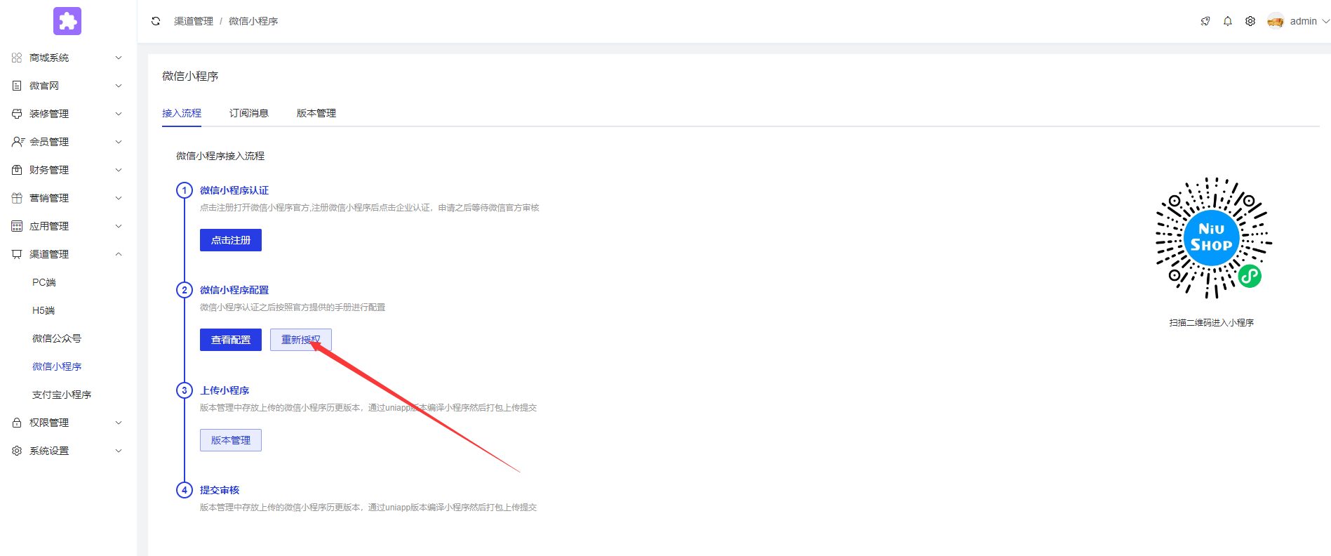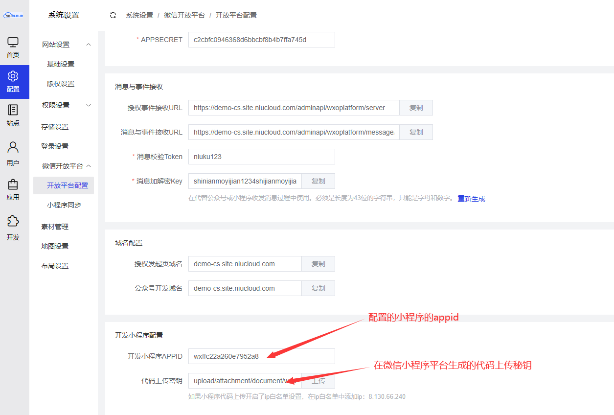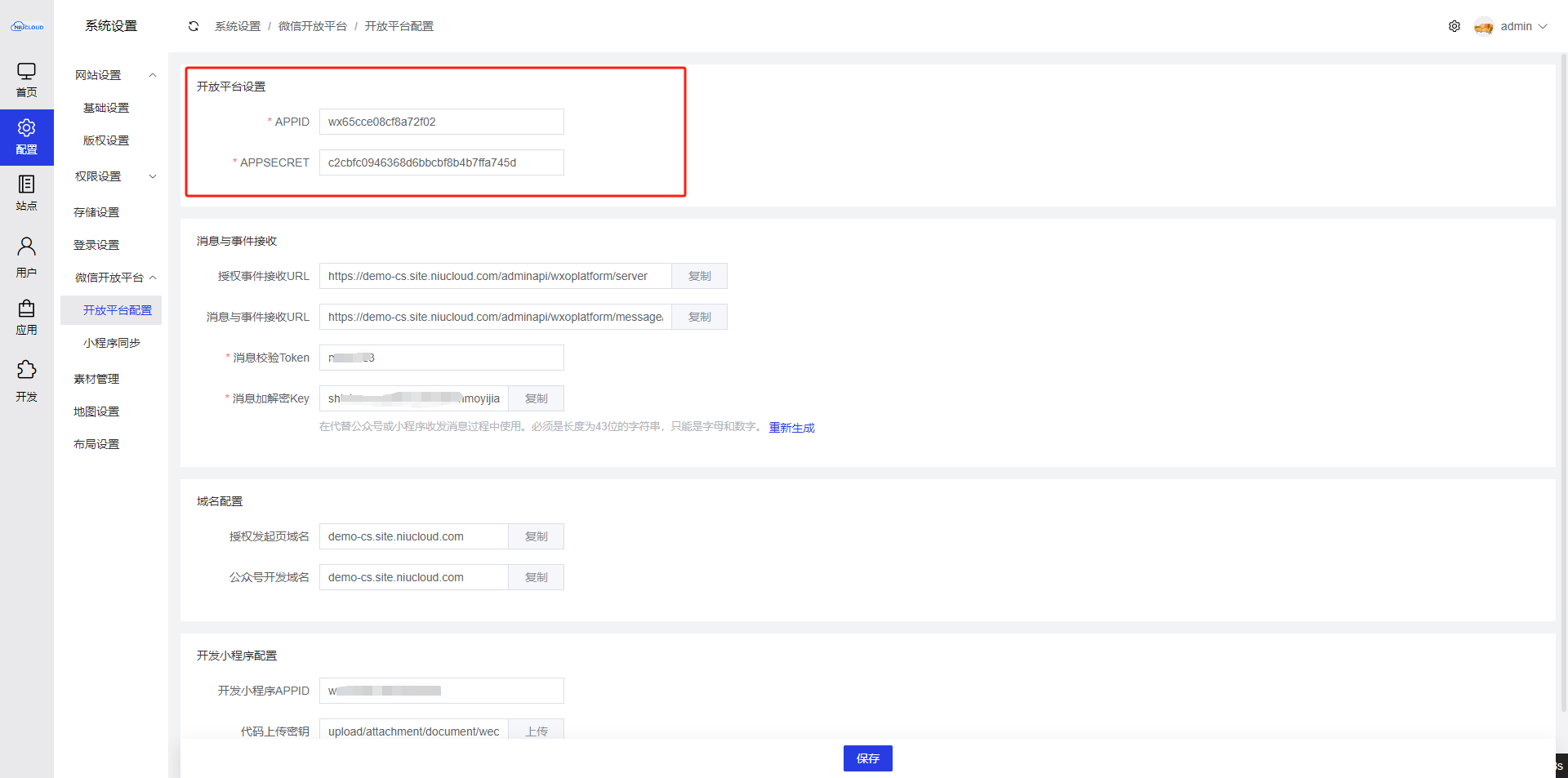 微信扫码,绑定站点要配置的小程序(注意:小程序必须是已认证并且未被其他站点绑定过才行)