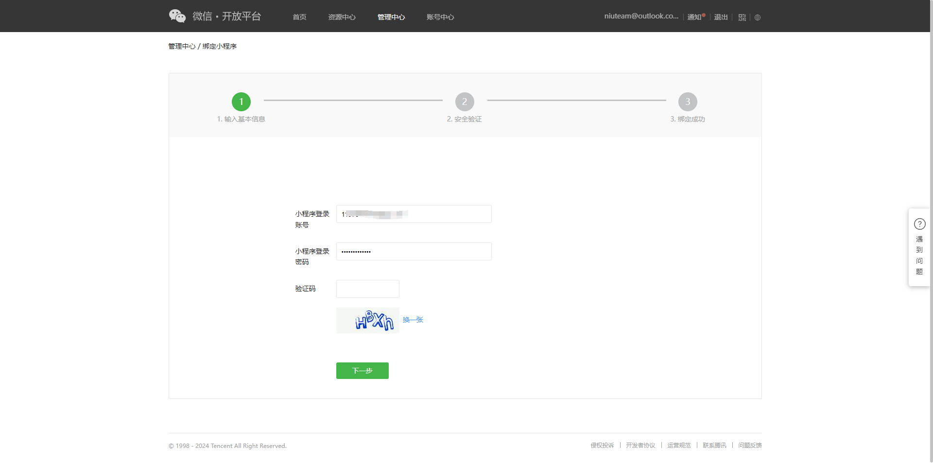 输入小程序登录账号和密码,点击下一步,使用该小程序管理员账号扫码后即可绑定。