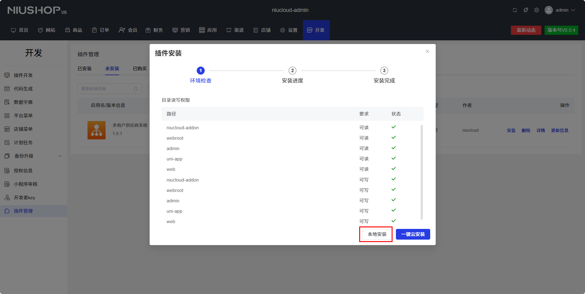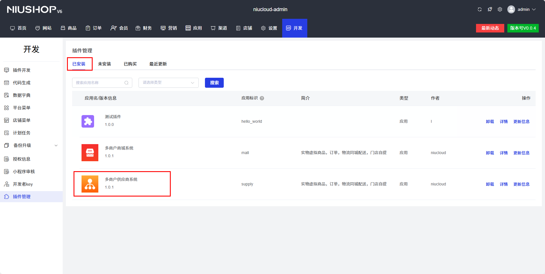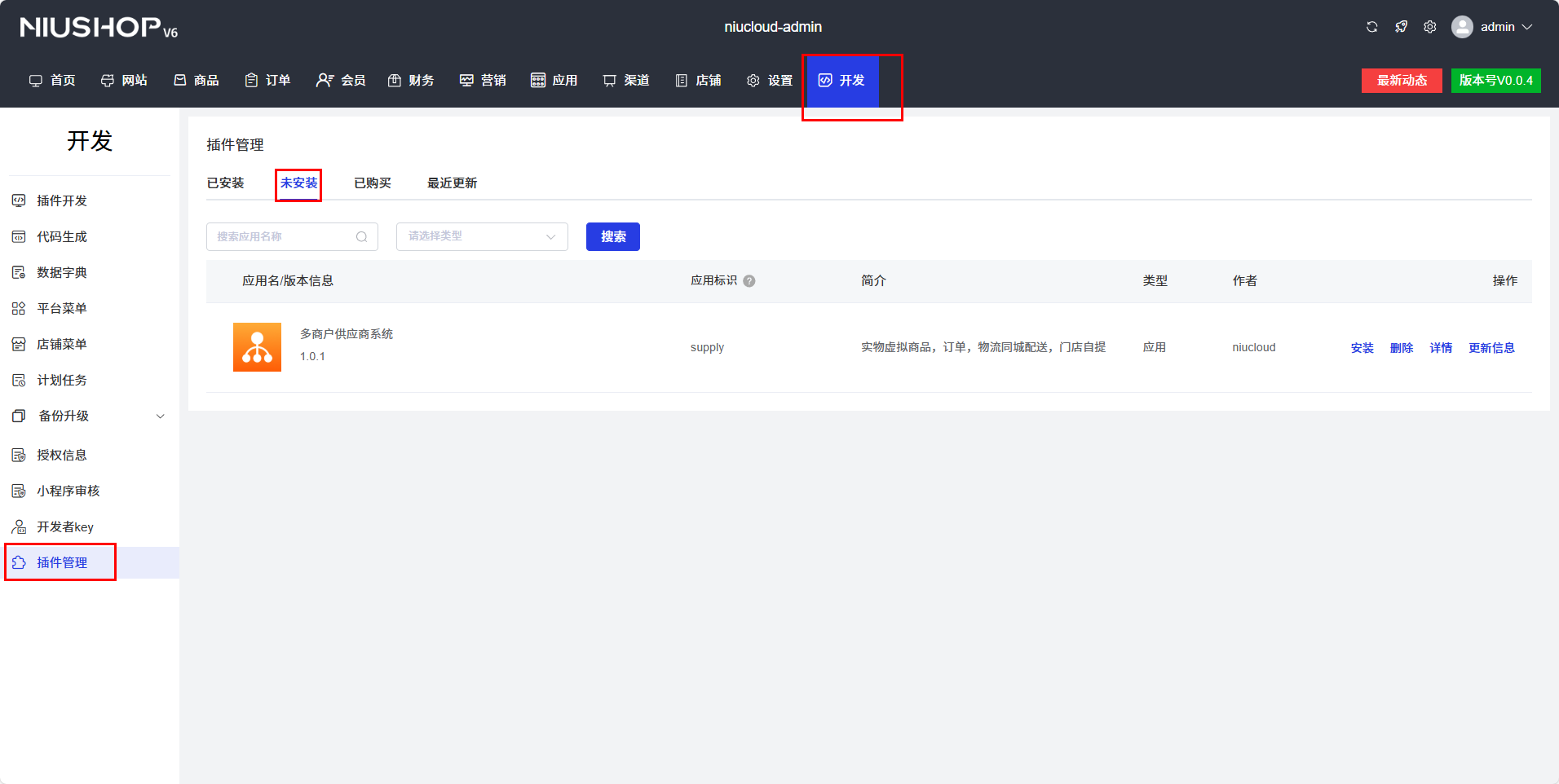 如下图所示,系统框架安装之后打开 admin 端,点击 开发 → 插件管理,会看到未安装的插件 点击安装