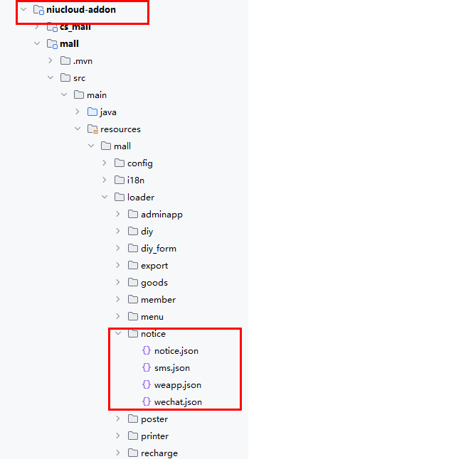 如果开发者开发一个插件,文件路径为:niucloud-addon/插件名称/src/main/resources/插件名称/loader/notice/