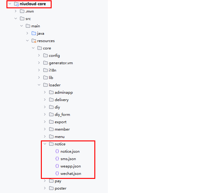 如果开发者直接是修改 niucloud-admin 框架,文件路径为:niucloud-core/src/main/resources/core/loader/notice/