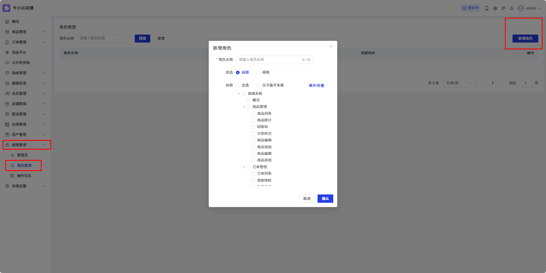 店铺端,在权限管理—>角色管理中,可以添加/编辑菜单来控制操作权限