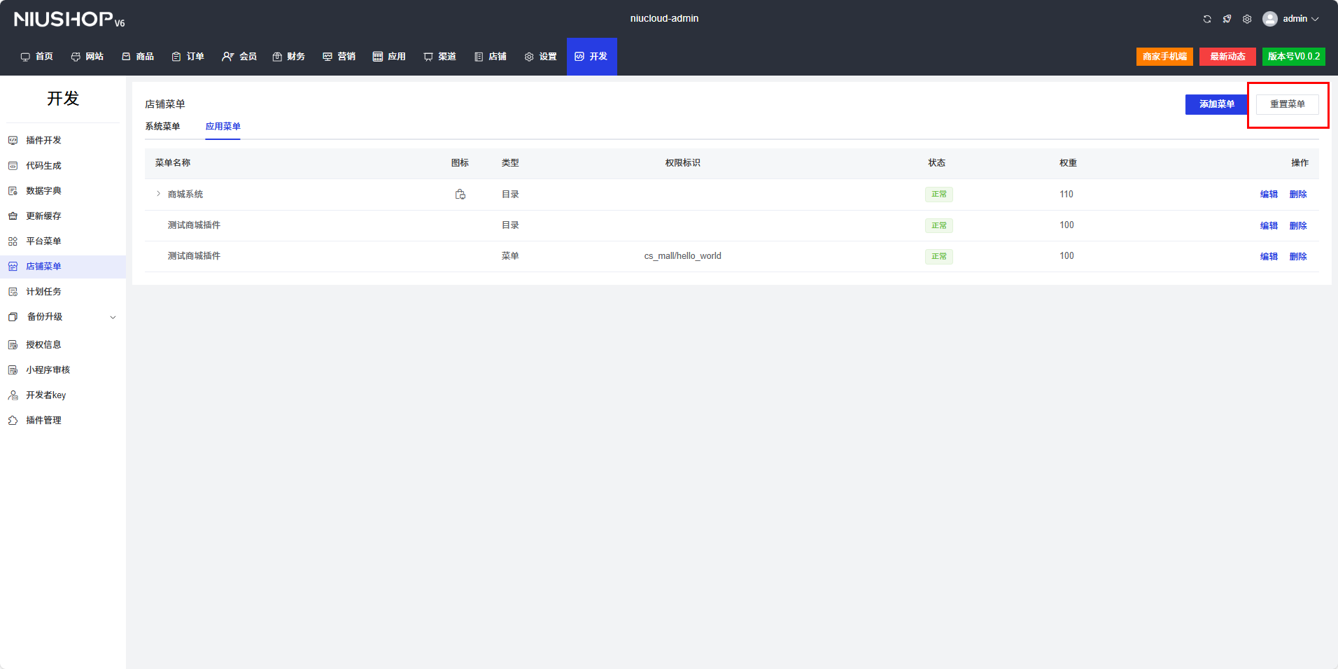 2.点击【开发】->【平台菜单或店铺菜单】->【重置菜单】