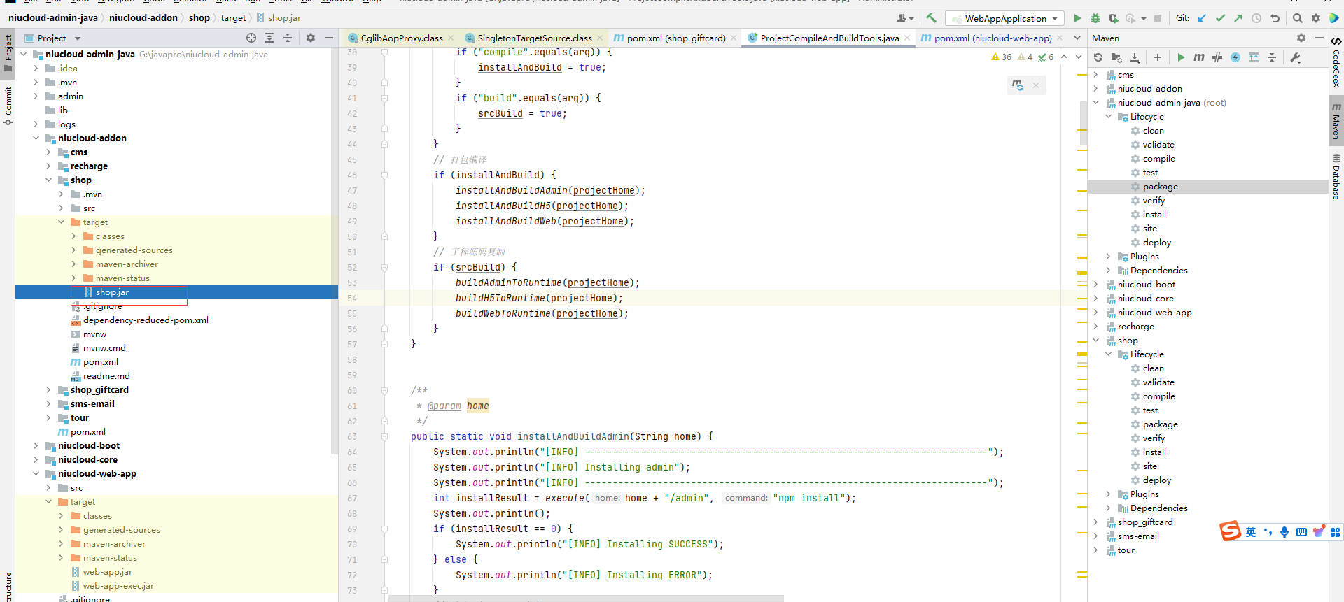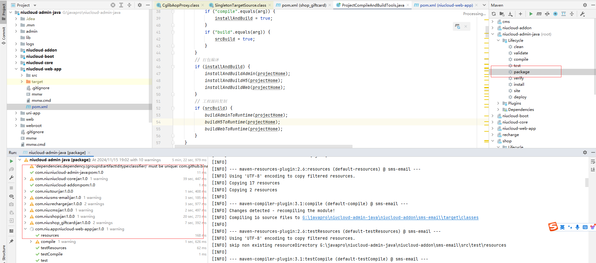 插件开发运行成功之后将包打包成jar包,执行maven的package命令,注意执行niucloud-admin-java模块的package命令
