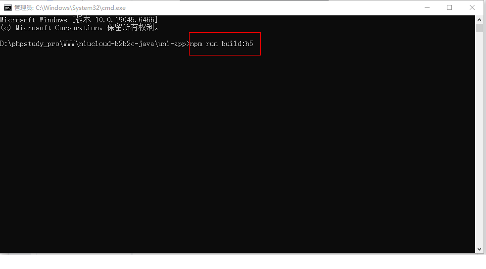 将文件切换到根目录下的 uniapp 下,cmd 启动命令行。执行命令 npm run build:h5 进行打包编译