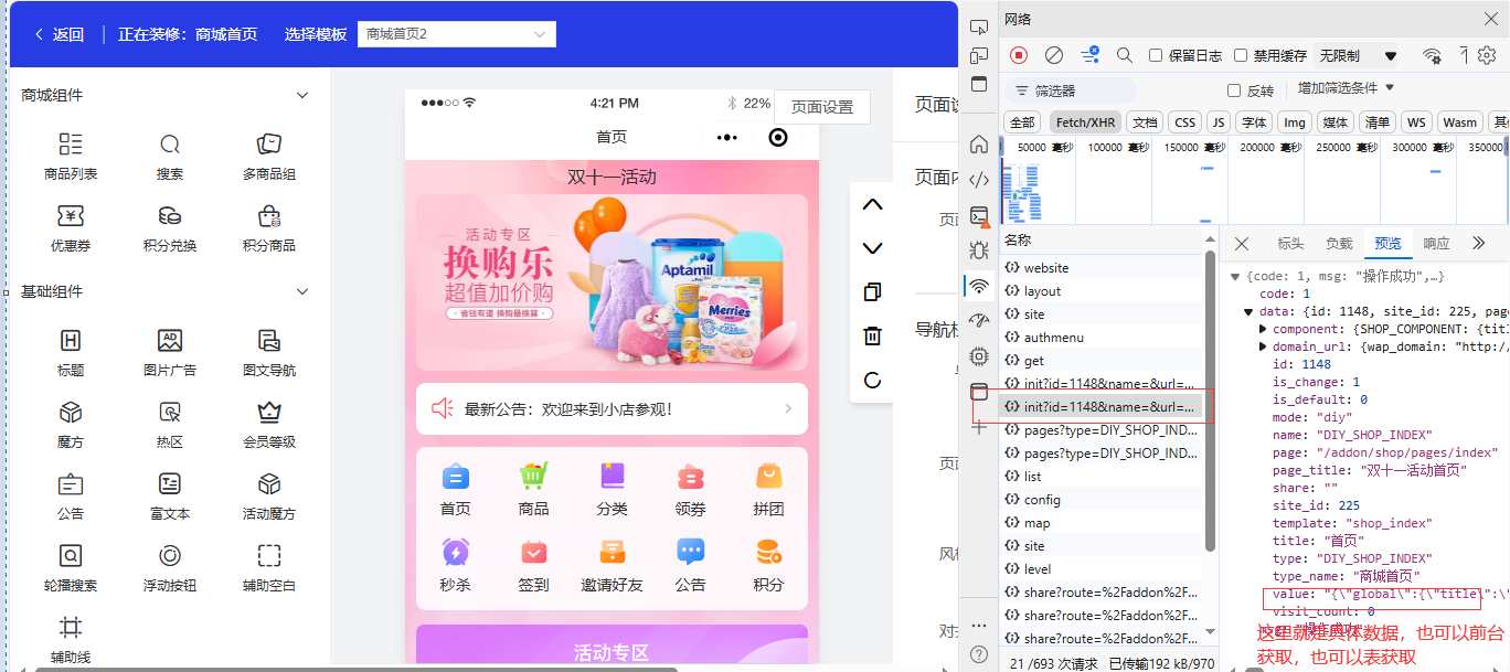 data 实际是编辑自定义模板后的数据结构,你可以自己编辑一个自定义模板,然后根据返回的数据整理一下做为制作自定义样式的数据,比如上述双十一模板样式
