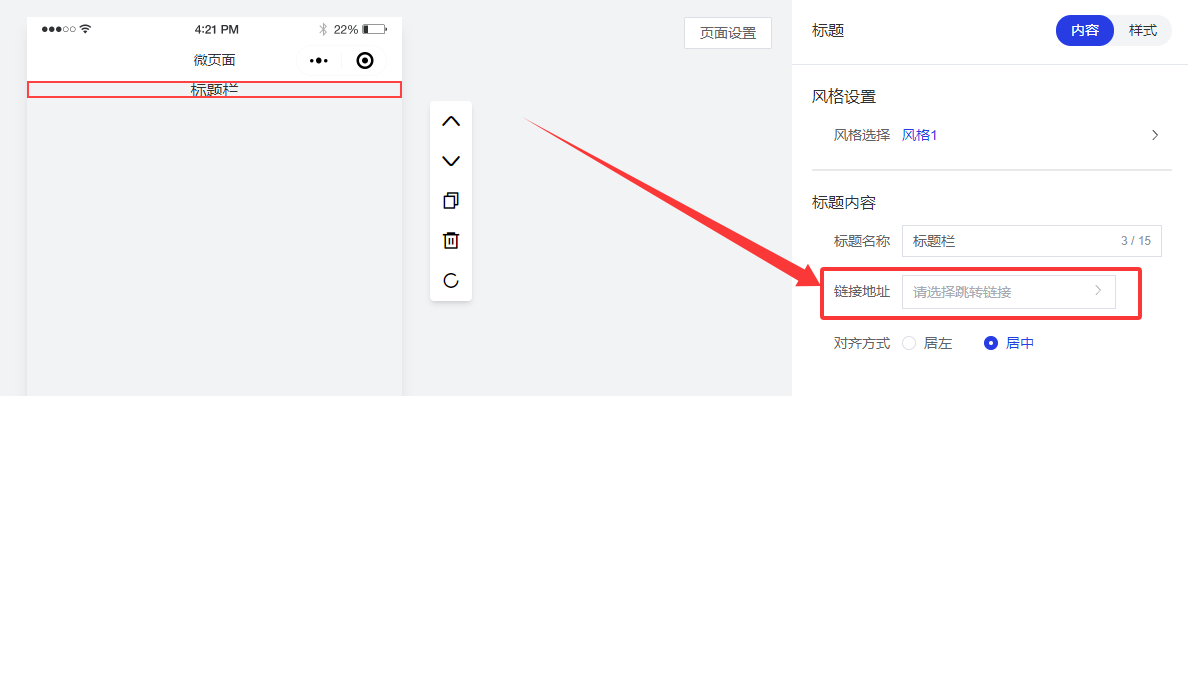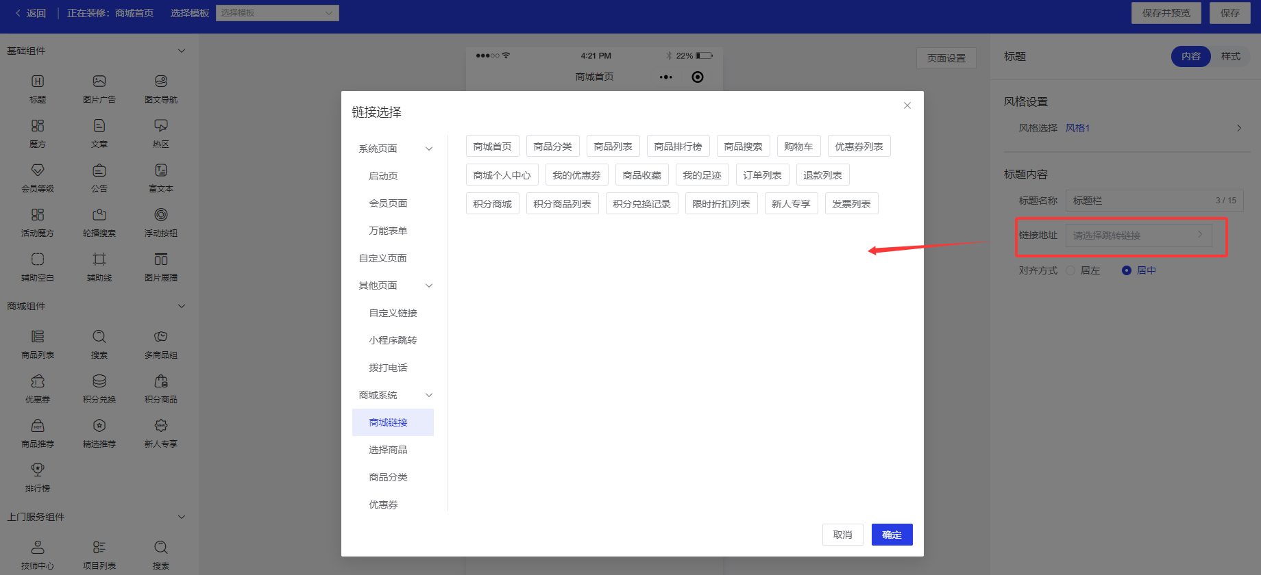 开发完成后,添加一个标题组件,点击链接地址,打开链接选择弹框即可看到