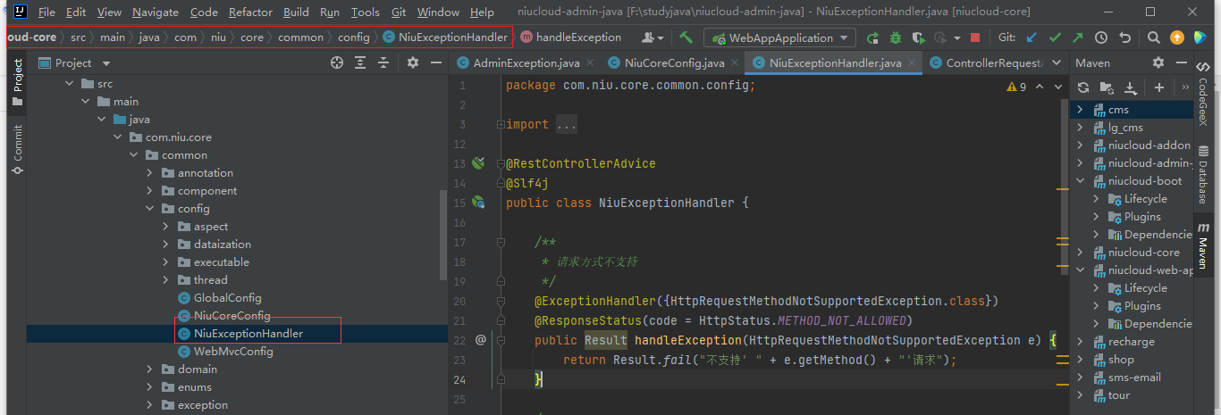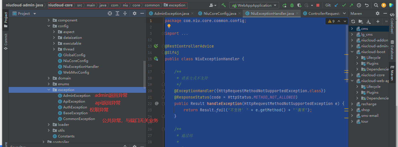try.....catch....对异常进行捕捉处理,但是在实际项目中对业务模块进行异常捕捉,会造成代码重复和繁杂,我们希望代码中只有业务相关的操作,所有的异常我们单独设立一个类来处理它。全局异常就是对框架所有异常进行统一管理。