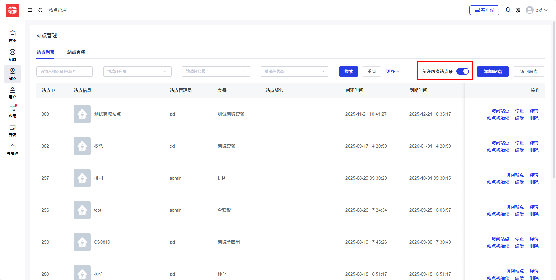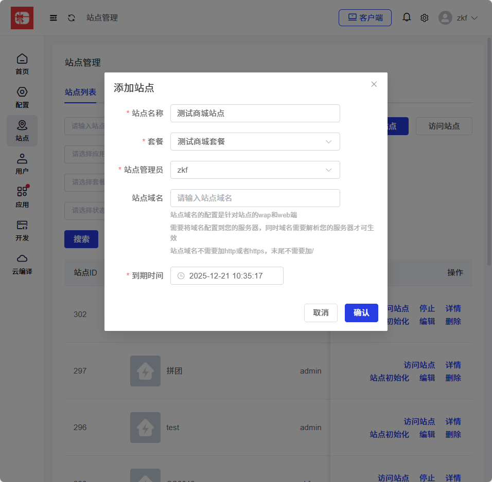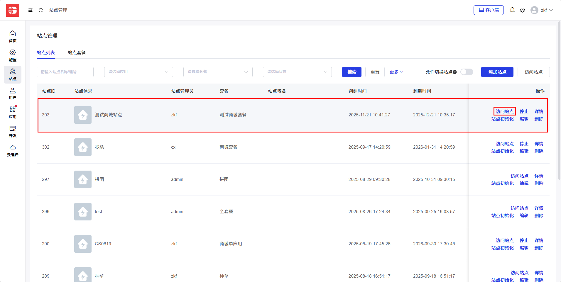 添加站点,选择套餐,注意站点管理员是系统的用户