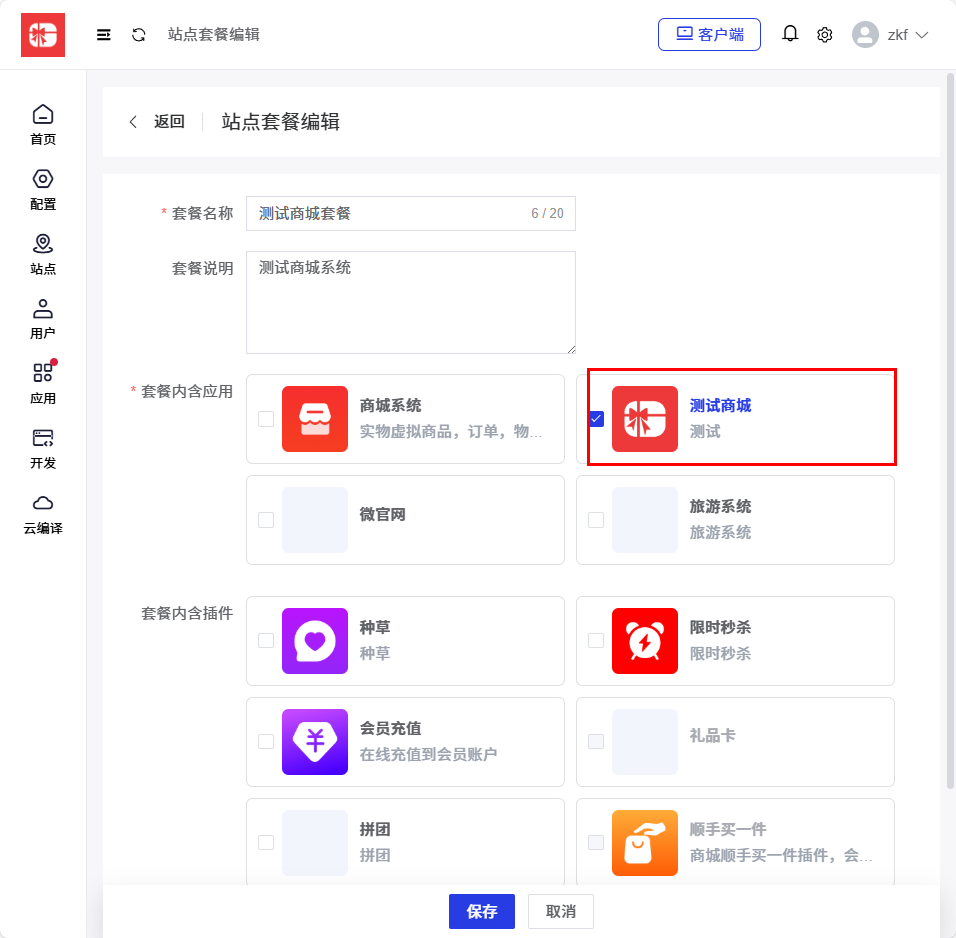 测试商城系统属于应用,安装之后可以添加套餐,选择对应应用