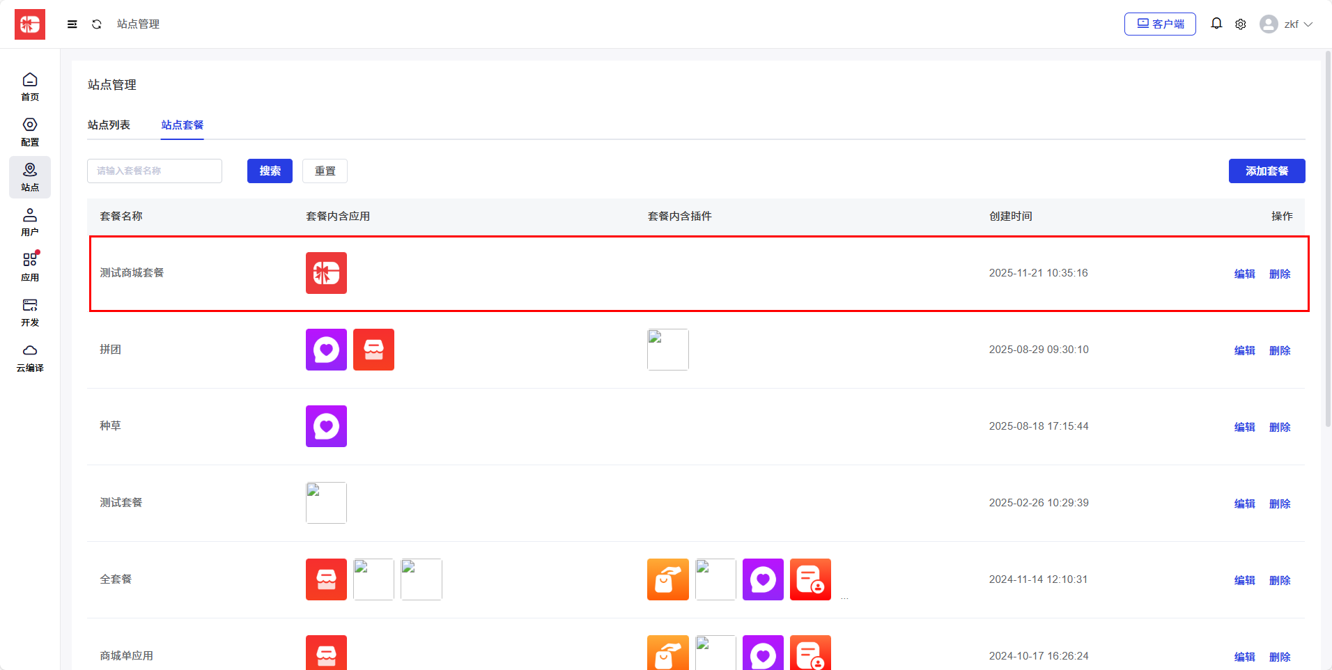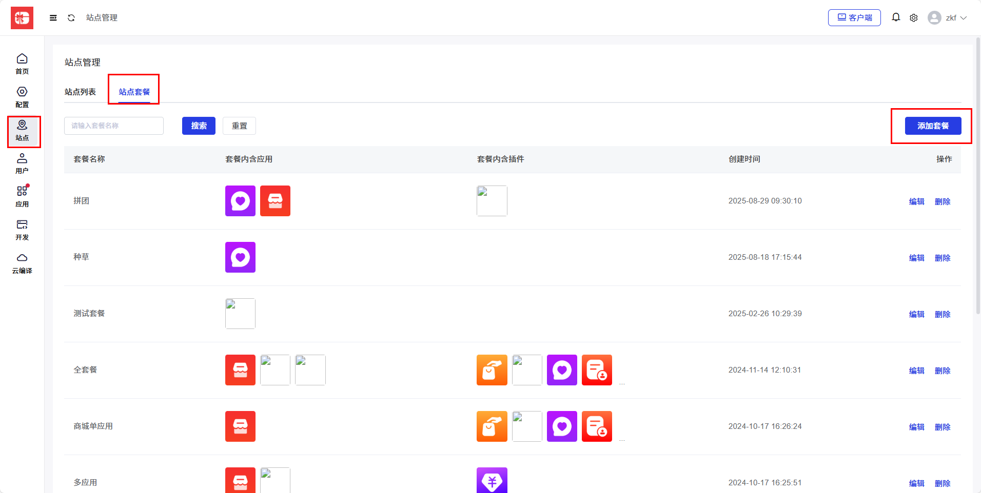 点击添加套餐,选择应用,方便添加站点选择套餐使用