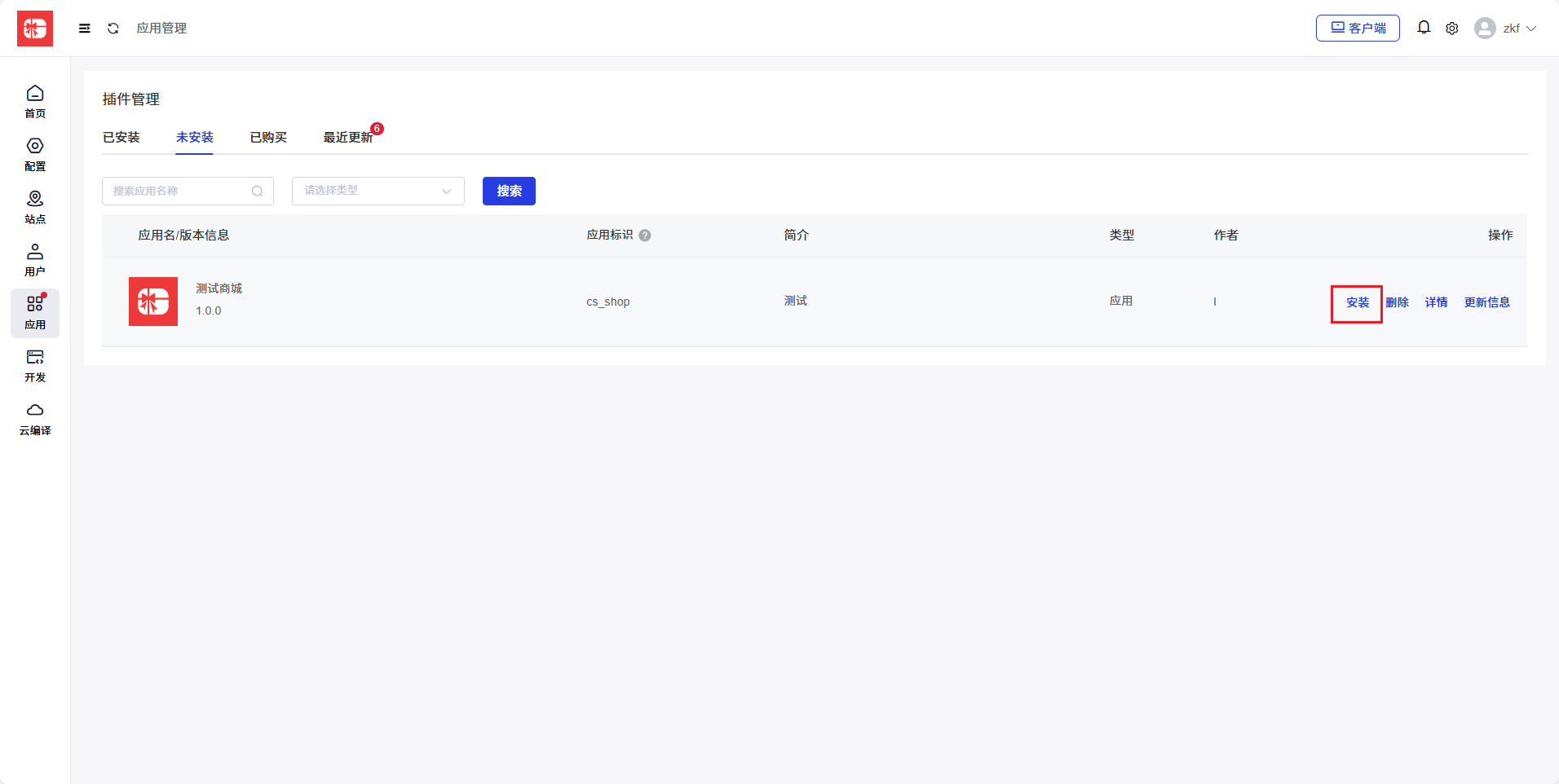 如下图所示,系统框架安装之后打开 admin 端,点击 应用→未安装,会看到未安装的插件,目前商城系统是开源的,可以看到未安装的商城应用,点击安装