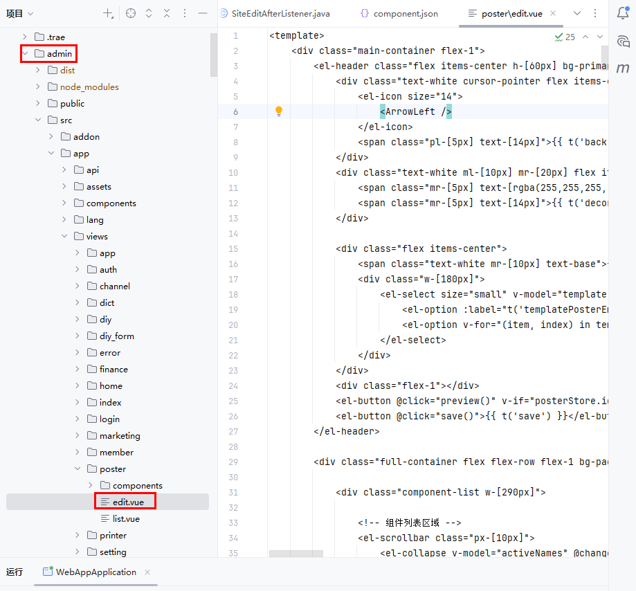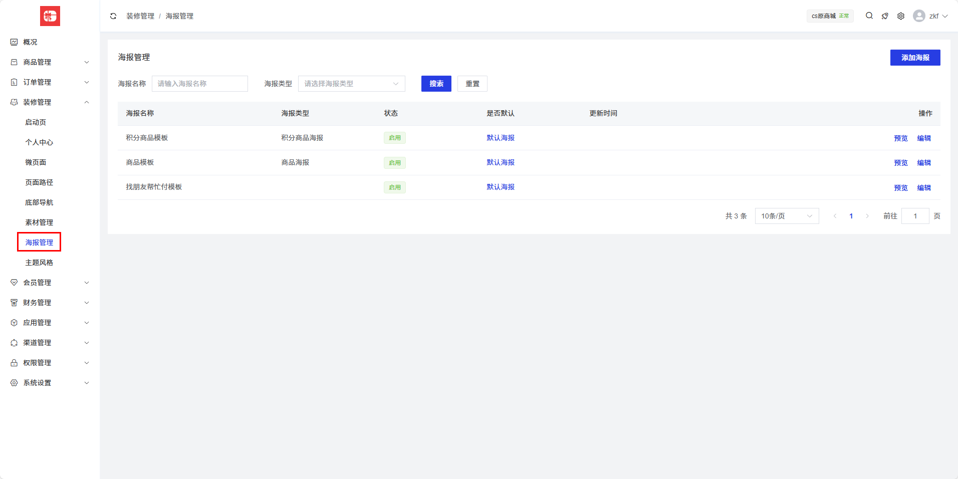 系统内置了海报装修页面,位于管理后台,开发者无需自行开发前端装修界面。装修页面支持拖拽操作、组件属性编辑、模板选择等功能。