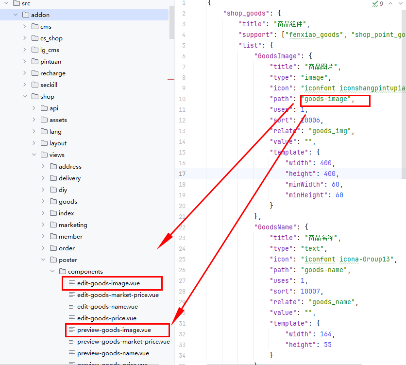 "path": "goods-image", // 属性编辑,在前端定义海报的预览组件和海报编辑组件时,组件预览前缀加edit-,编辑组件属性前缀加preview-