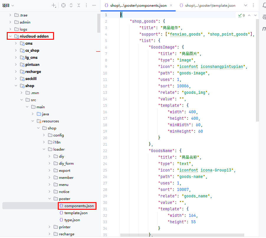 定义海报组件文件位置:niucloud-addon/shop/src/main/resources/shop/loader/poster/components.json