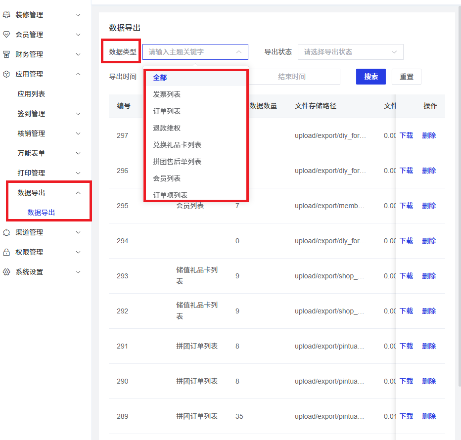 type:数据导出类型