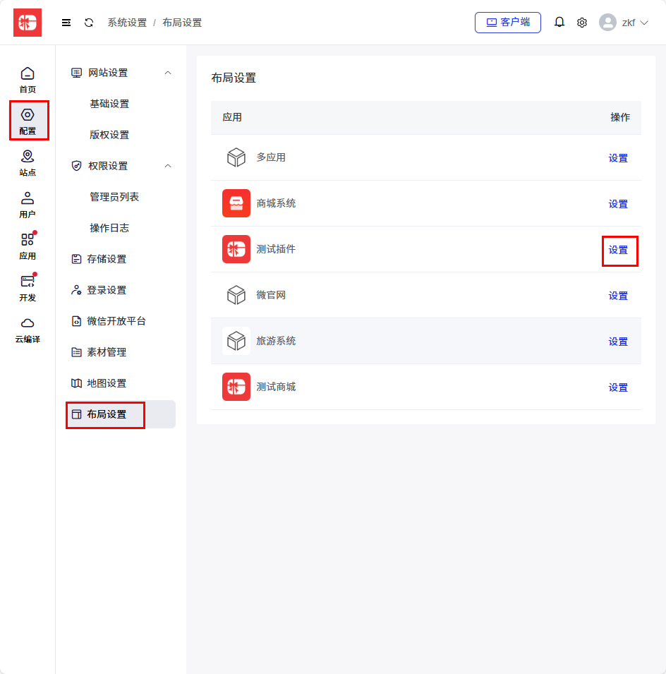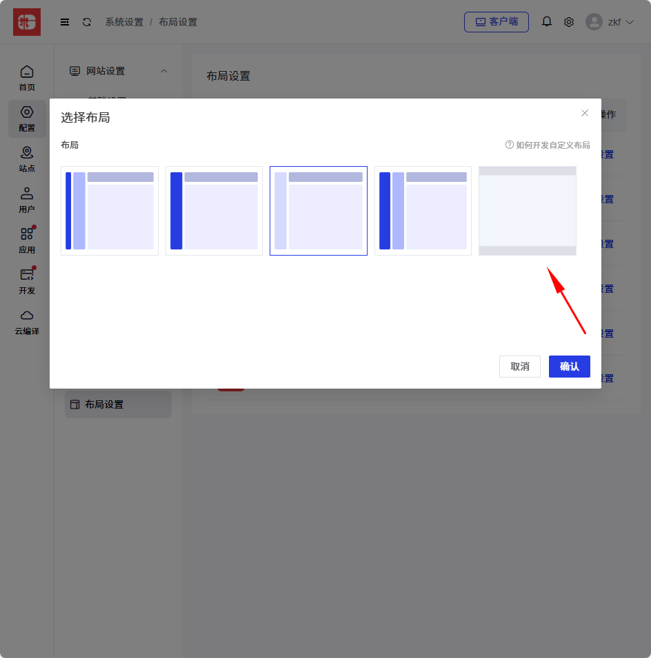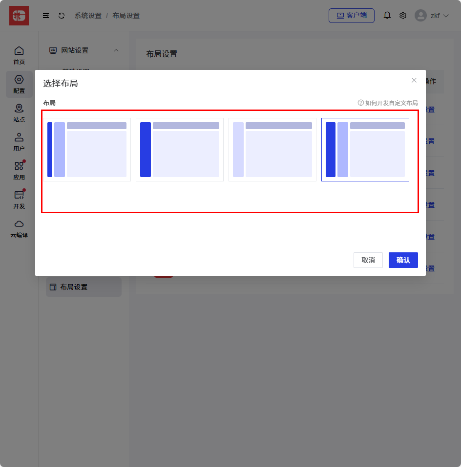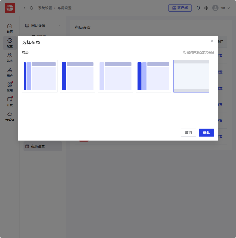 平台端可以给每个应用设置布局:在 admin 端打开配置->布局设置->点击应用后的设置,选择开发好的布局方式,点击确认,再次进入该单应用的站点布局就会修改成功