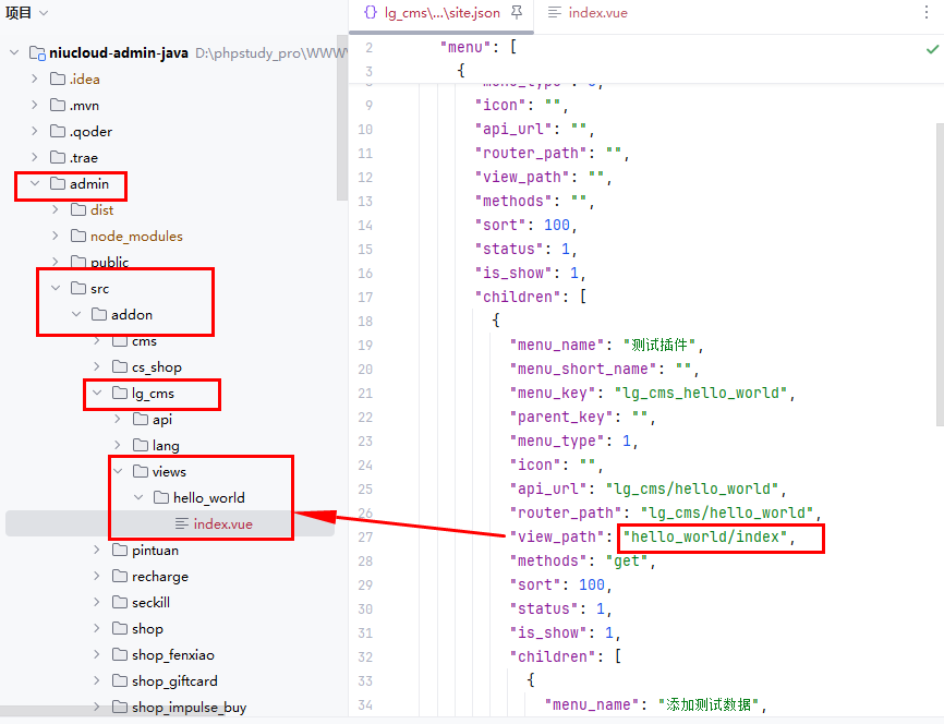 插件中也可以自定义菜单项,niucloud-admin 框架对于插件的约束是宽容的,插件可以对整个系统的菜单项进行操作。甚至可以操作标准菜单定义。插件中菜单项的定义位置与标准菜单项的定义方式几乎相同