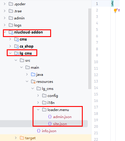 站点管理端菜单项在 niucloud-addon/lg_cms/src/main/resources/lg_cms/loader/menu/site.json