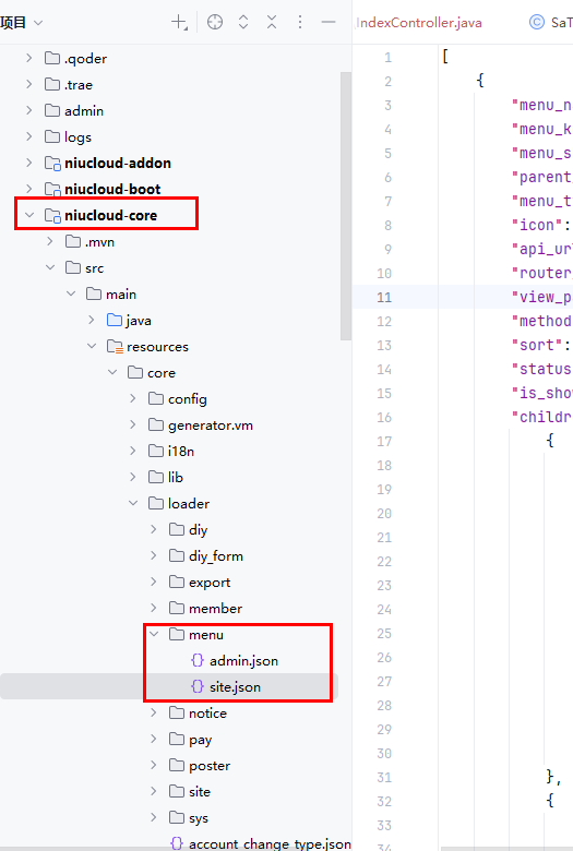 站点管理端菜单项文件位置: niucloud-core/src/main/resources/core/loader/menu/site.json