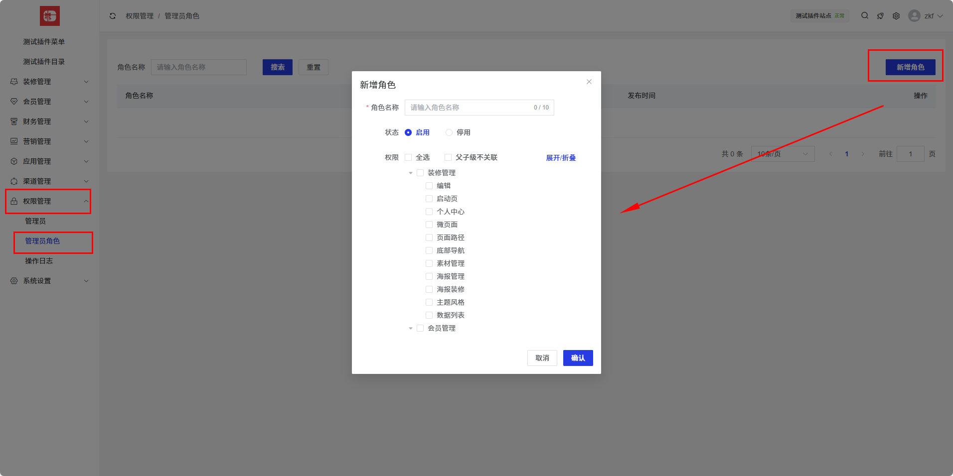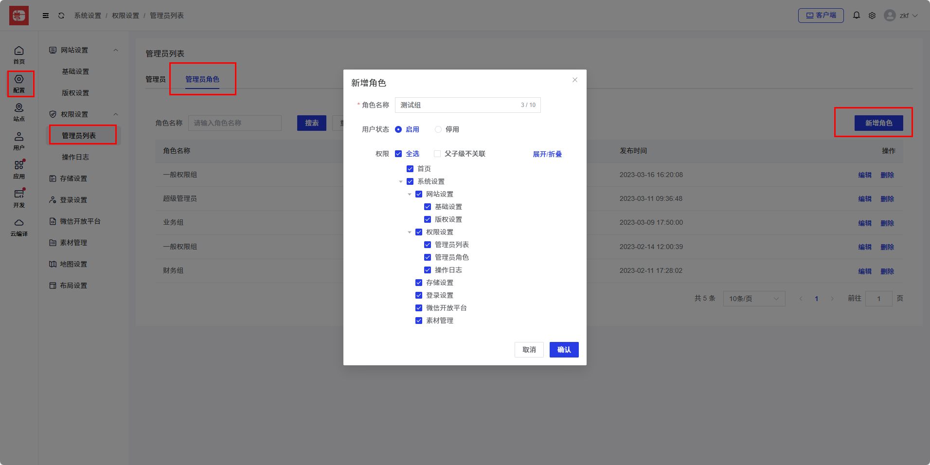 站点端,在权限管理—>管理员角色中,可以添加/编辑菜单来控制操作权限