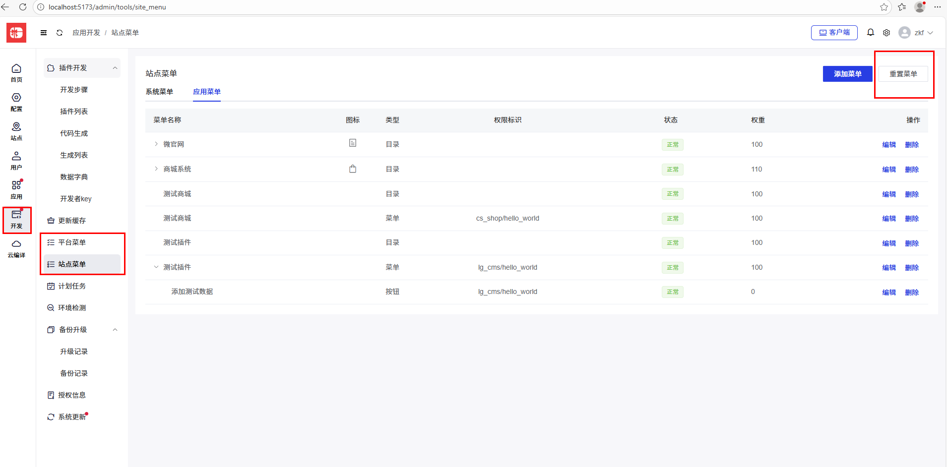 2.点击【开发】->【平台菜单或站点菜单】->【重置菜单】