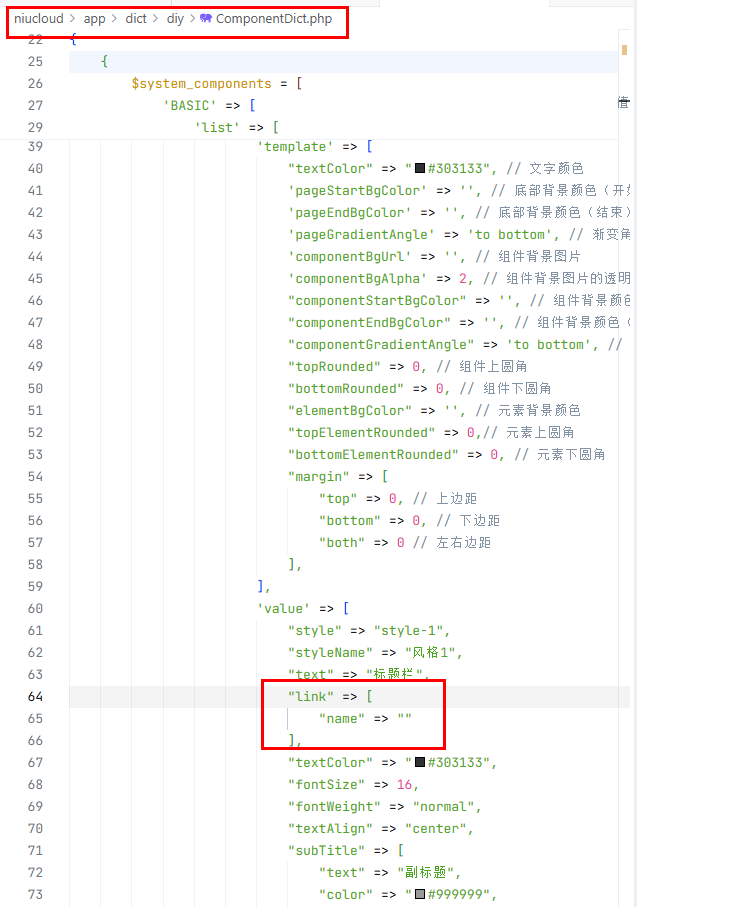 组件需要定义存储自定义链接的字段。例如,link(名称可以修改)。注意:一定要加上 name = "",否则php空数组将会转换成JavaScript空对象,导致数据绑定出现问题