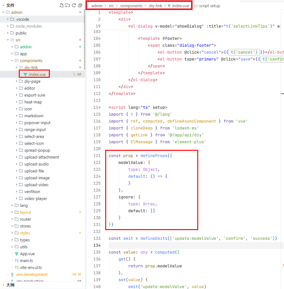 开发者在开发自定义组件的右侧编辑属性组件时,可能需要设置自定义链接的业务场景。此时可以引入系统框架封装的diy-link自定义链接选择弹框组件