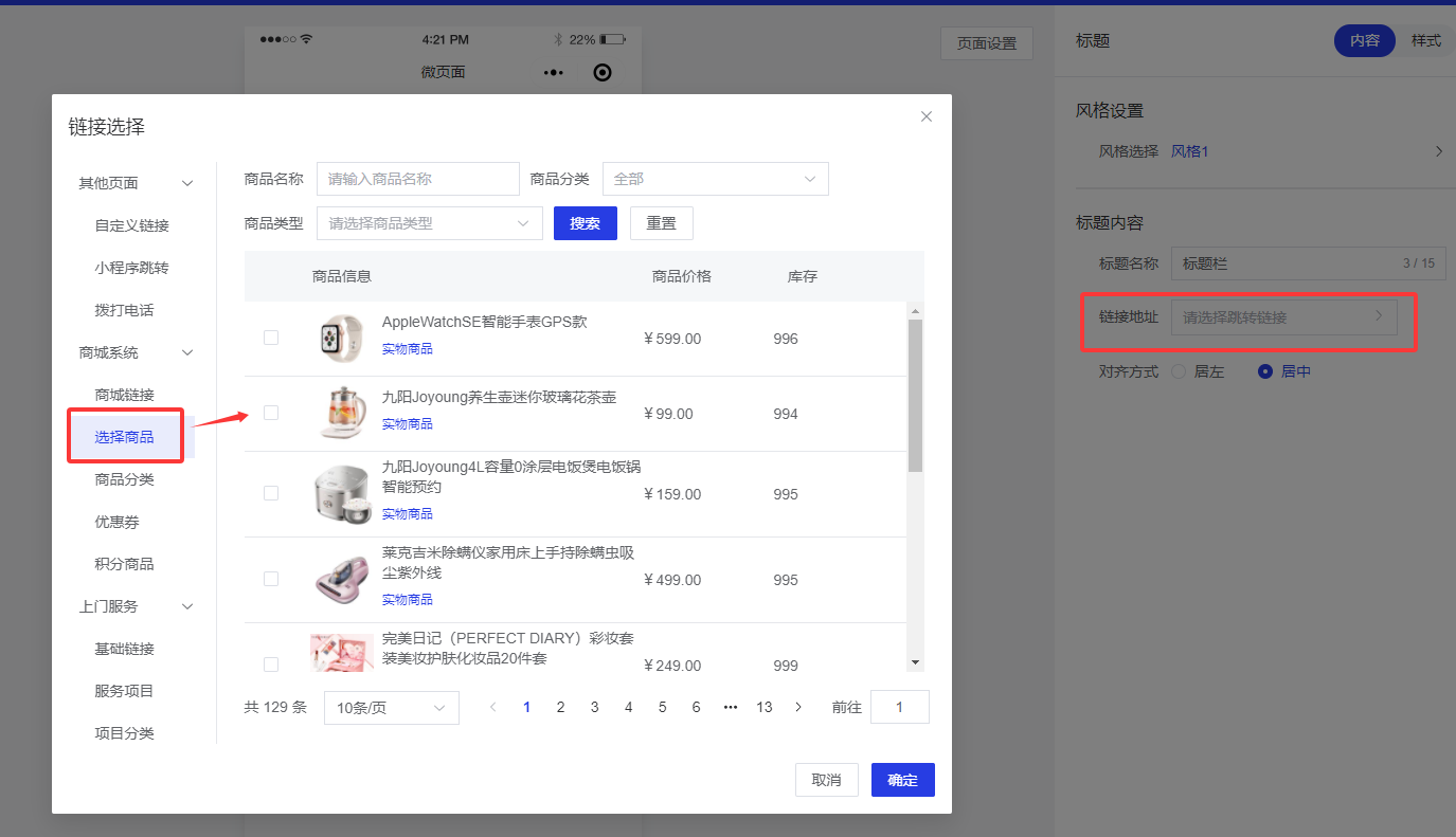 开发完成后,添加一个标题组件,点击链接地址,打开链接选择弹框即可看到