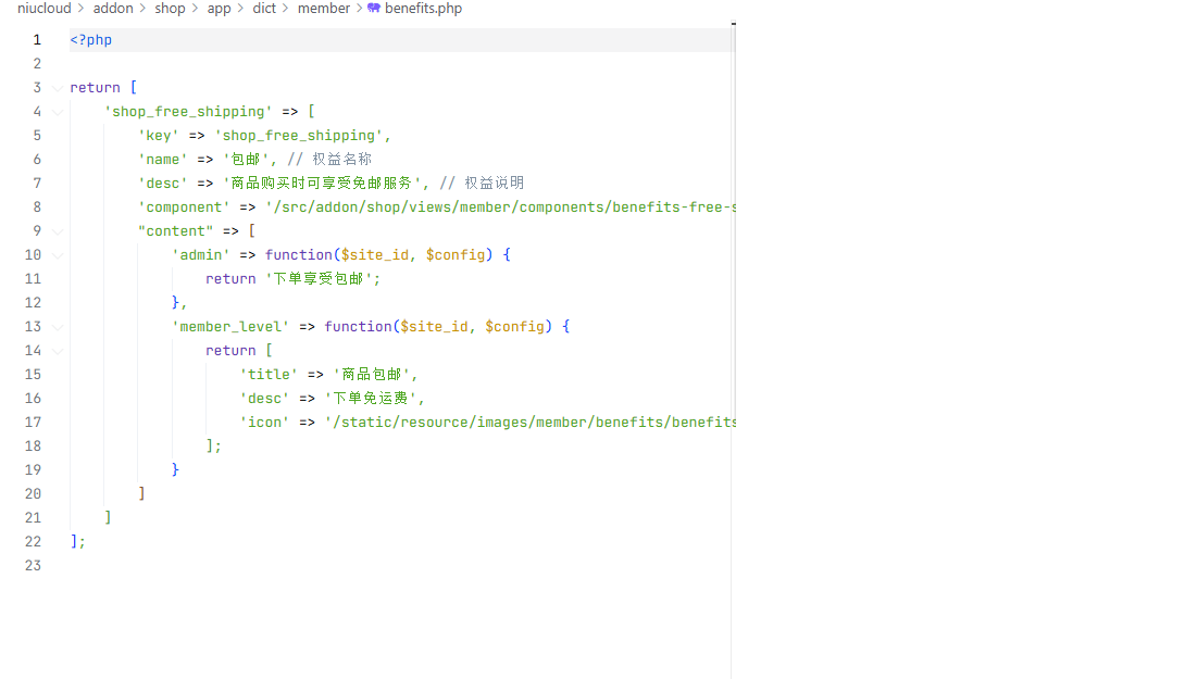 注意:文件名称必须是benefits.php,框架会寻找所有插件下的这个文件,进行加载