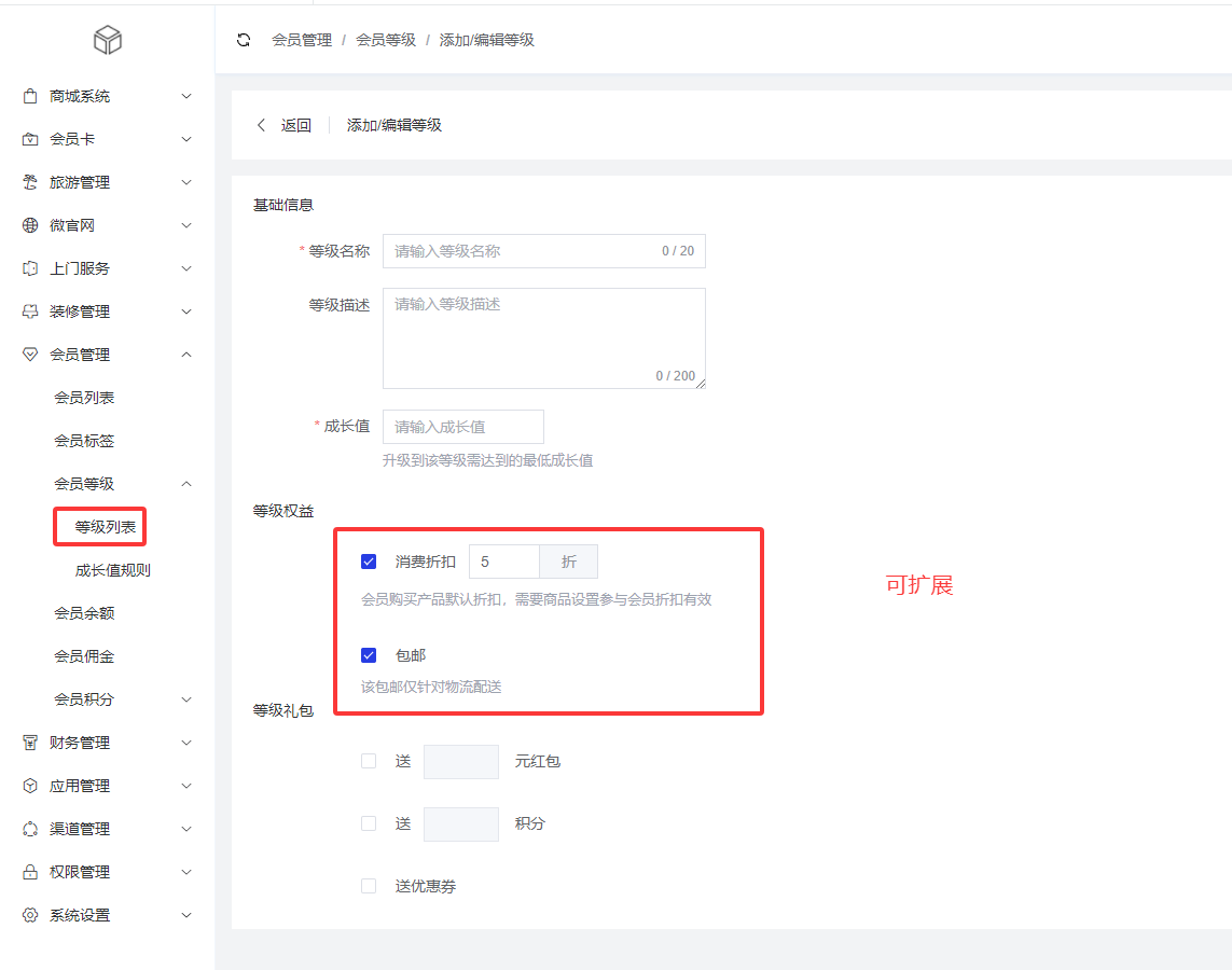 用于会员开发:会员账户类型、会员等级权益、会员签到礼包、会员成长值规则、会员积分规则等