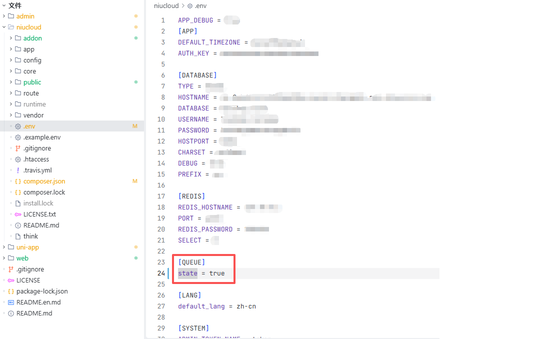 先打开项目根目录的.env 文件,将queue下的state改成true(如果.env文件中没有queue配置的话要手动添加)